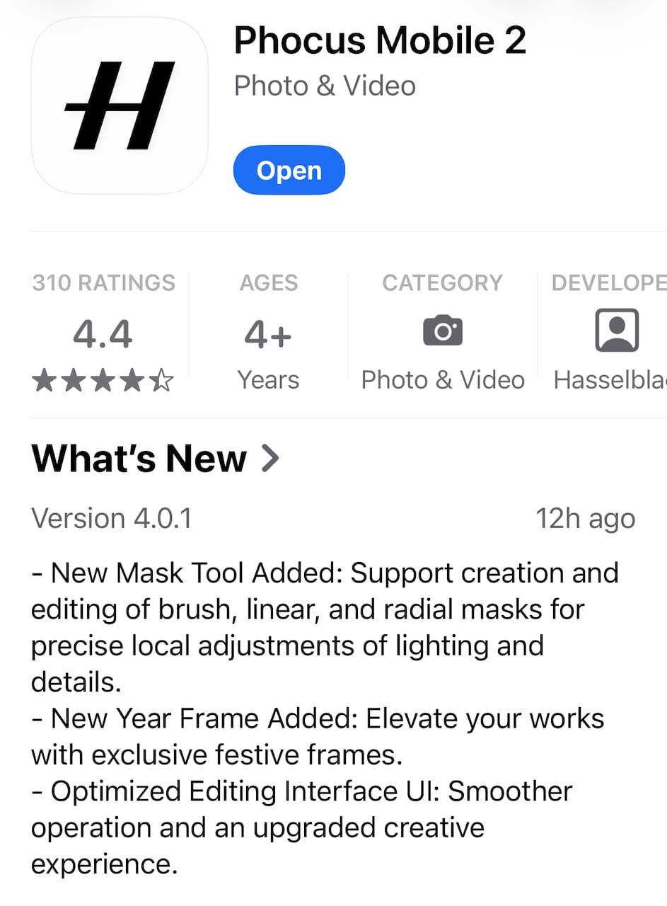 Hasselblad pushed Phocus Mobile 2 v4.0.1 to the App Store this week. If you were hoping for a changelog, you'll be disappointed - the release notes are identical to v4.0.